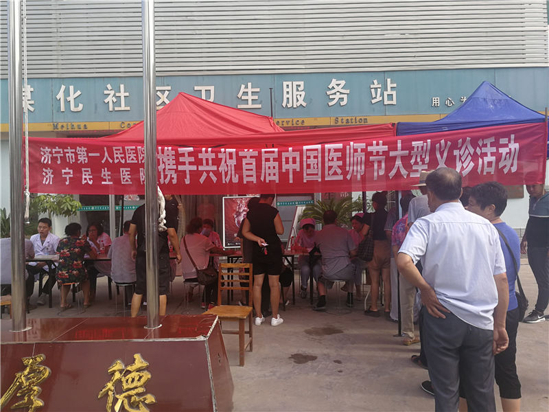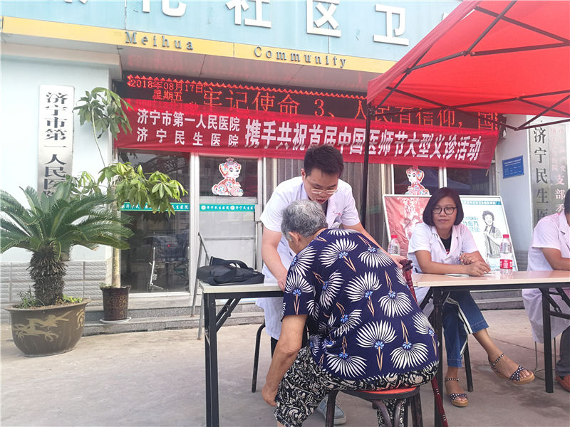 2018年8月17日,济宁市第一人民医院组织心内科、神经内科、内分泌科、眼科、脊柱外科专家和济宁民生医院携手在煤化社区服务卫生站开展了首届医师节专家义诊活动,为群众免费提供健康咨询、健康检查等医疗服务,以为民服务的方式庆祝自己的节日,表达他们对职业的热爱,用实际行动为人民的健康保驾护航。