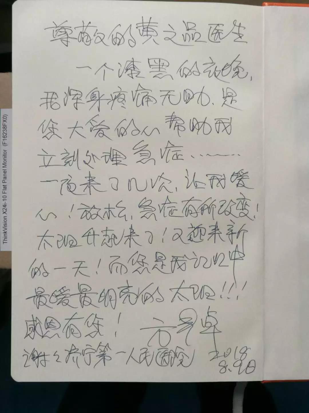 在黄之品医生及陈晓楠护士的精心治疗及护理下,方青卓老师留观4小时后,其腹痛腹泻症状已完全缓解,为了感谢济宁市第一人民医院感染性疾病科给予的精心治疗及护理,亲自写下了感谢信。
