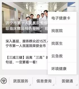 关注济宁市第一人民医院微信公众号,点击医健通,即可进入: