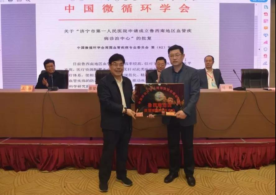 会上,中国微循环学会副主任委员,北京朝阳医院血管外科主任张望德宣读了关于“济宁市第一人民医院申请成立鲁西南地区血管疾病诊治中心”的批复,并代表中国微循环学会为济宁市第一人民医院授牌。