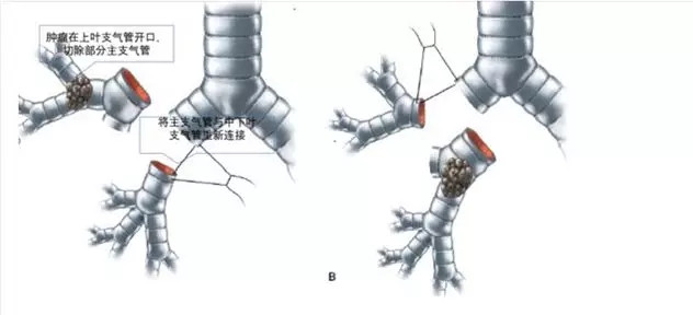 链接:肺袖式切除-简称袖切,是一类为了避免全肺切除,复杂的肺叶切除重建手术。如图所示当病变位于肺叶支气管开口时,单纯切除相应肺叶会造成肿瘤残留,因此,要完全切除肿瘤,需要切除相应肺叶支气管及相连一段主支气管,称为袖式切除。肺叶袖式切除后,外科医生还要将余肺支气管与主支气管重新缝合连接。更复杂的情况,如果病变侵及血管,还需要切除受侵血管,然后重新缝合,重建血管,称之为双袖式手术。