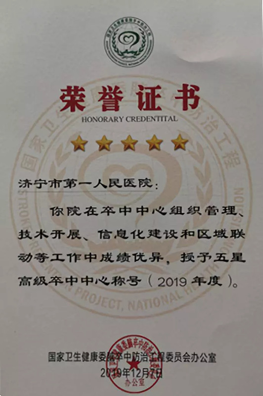 近日,从国家卫生健康委脑卒中筛查与防治工程委员会主办的“2019年脑卒中防治工程总结会”上传来喜讯,济宁市第一人民医院被授予“五星高级卒中中心”单位,这是继医院获得“国家高级卒中中心”称号之后的又一国家级殊荣。