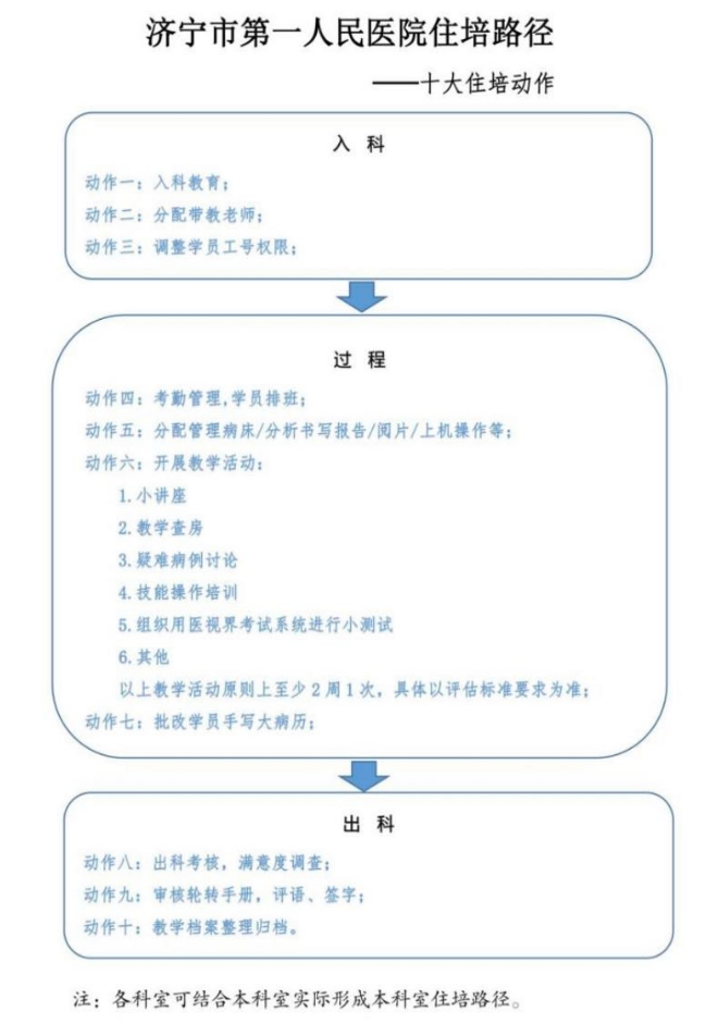 住培工作既需要细心、耐心,更需要创新。今年5月,济宁市第一人民医院“住培路径”工作创新开展。在“济宁市第一人民医院住培路径——十大住培动作”流程表上,住培流程、住培动作一目了然。同时根据统一住培路径,结合各科实际,各科室各具特色的住培路径也正逐渐形成。
