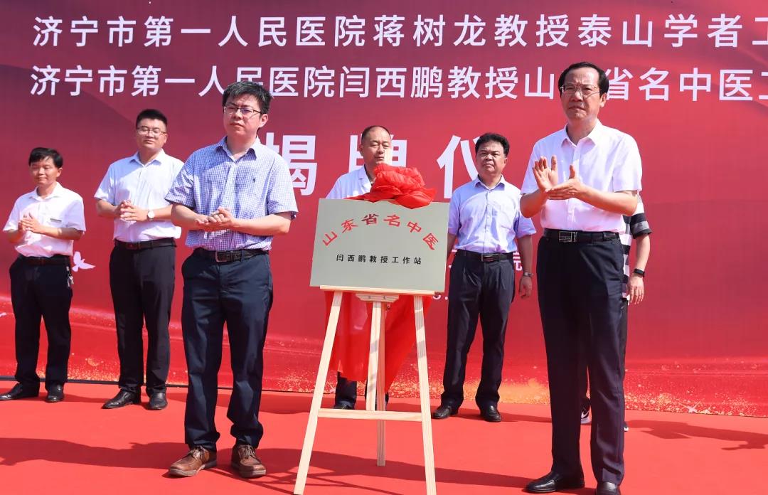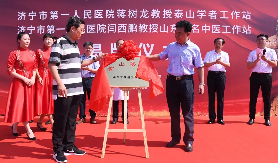仪式上,郭洪敏、李刚、孔卫东、蒋树龙为“泰山学者蒋树龙教授工作站”和“山东省名中医闫西鹏教授工作站”揭牌。