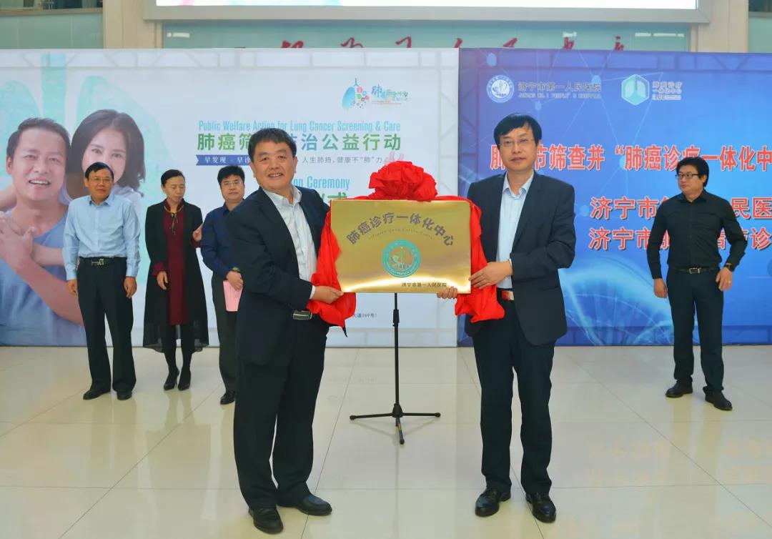 医院副院长乔森、市肺小结节诊治中心、医院胸外科主任张康共同为济宁市第一人民医院肺癌诊疗一体化中心揭牌,并为济宁市第一人民医院肺癌筛查防治公益行动剪彩。