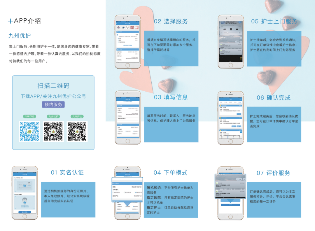对于有居家护理需求的患者,只需在九州优护平台上填写相关信息,实名认证后申请下单,护理人员根据网上信息对患者状况初步评估,并跟患者或家属进行信息认定,双方进行时间、地点及注意事项的沟通。护士上门服务时,开启护士端APP,进行定位、录音、拍照,实现服务行为全程留痕追溯。以“线上申请、线下服务”的模式,搭建了医、护、患三者信息共享平台,满足了区域内罹患疾病且行动不便的特殊人群居家护理需求。