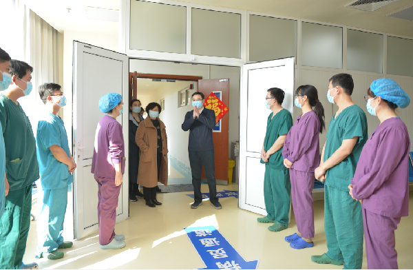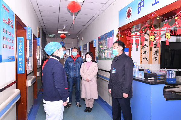 2月12日, 大年初一,济宁市第一人民医院党委书记孙树印、院长钟海涛带领医院领导班子、职能科室负责人一起,分别赶往医院总院区、东院区、西院区,走访慰问春节期间坚守岗位的一线工作人员,衷心感谢他们在过去一年中为疫情防控与患者救治作出的贡献,并向他们送去了新春祝福。同时叮嘱他们严格落实疫情常态化防控各项措施,强化安全生产管理,全力确保人民群众过一个欢乐、祥和、平安的春节。