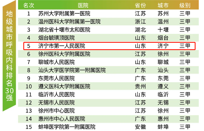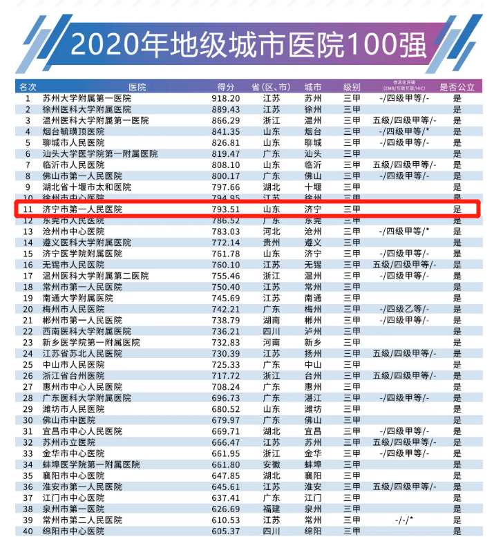 【重磅】2020年地级市医院百强榜发布,济宁市第一人民医院位列第11位,17个专科荣登30强榜单!