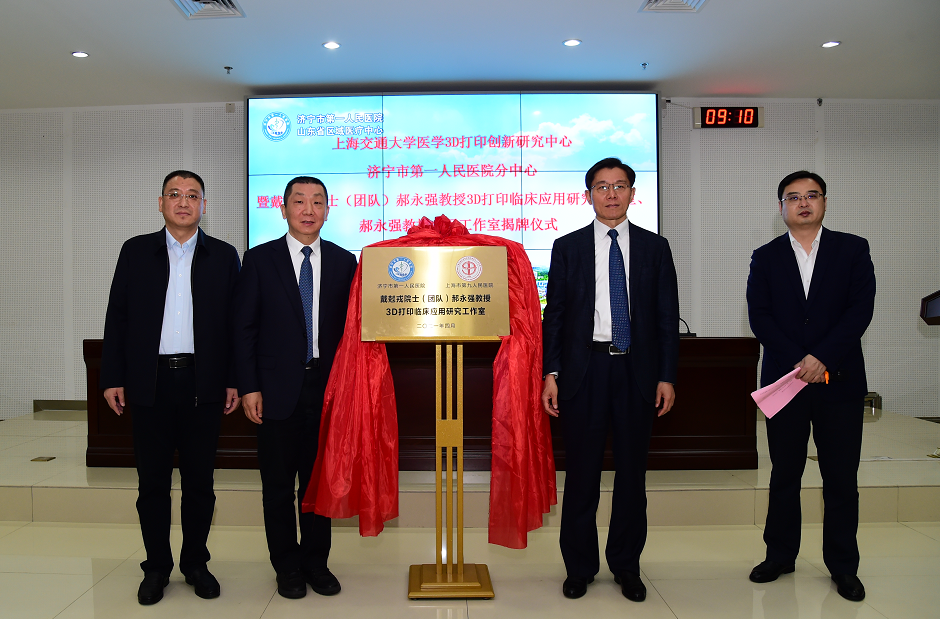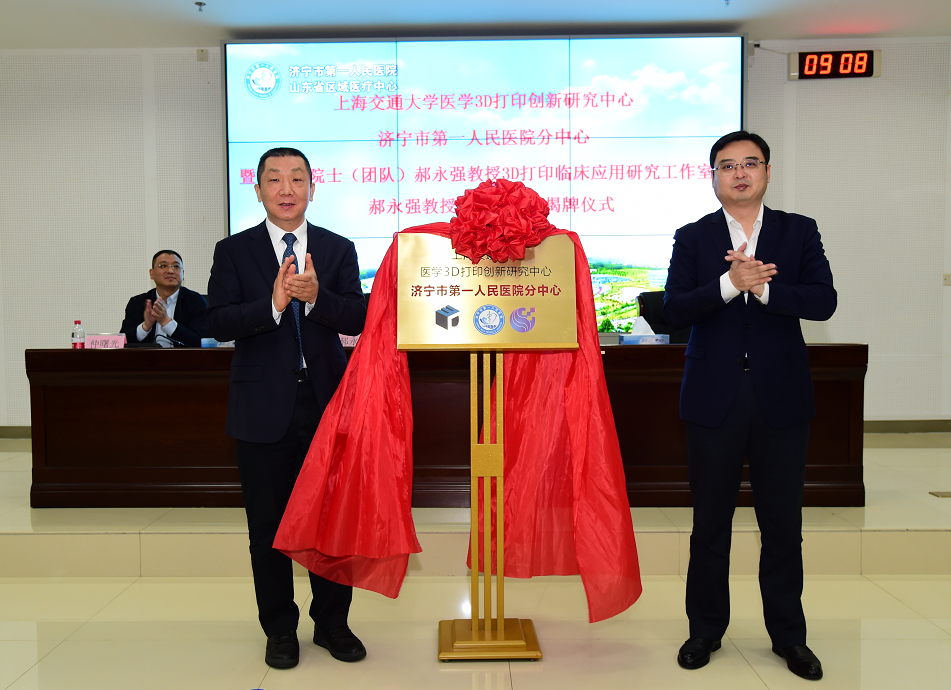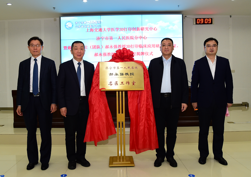 在热烈的掌声中,与会领导分别为“上海交通大学医学3D打印创新研究中心济宁市第一人民医院分中心”、“郝永强教授名医工作室”、 “戴尅戎院士(团队)郝永强教授3D打印临床应用研究工作室”揭牌。