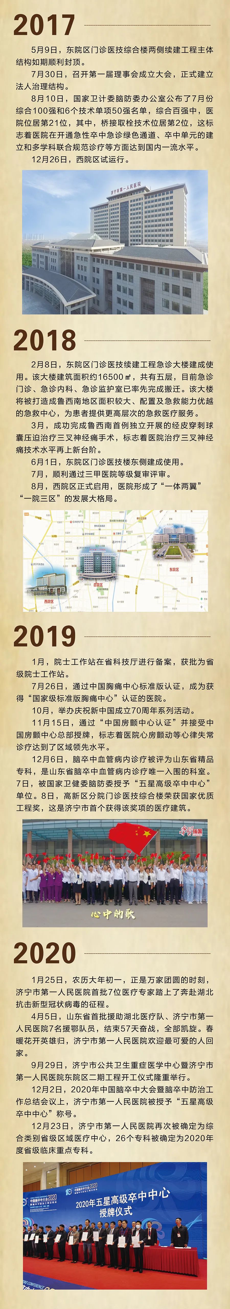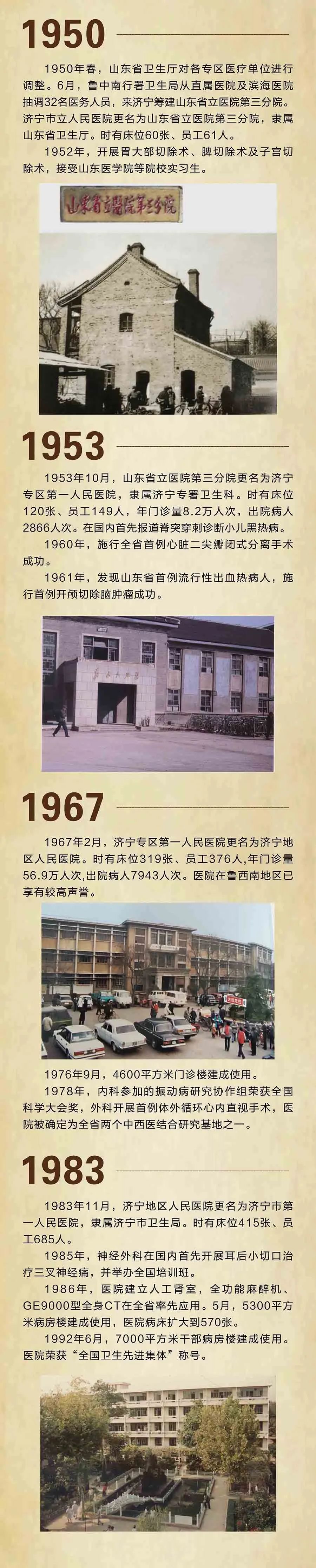 百年岁月如歌,是一段述说不尽的动人故事;百年雄关漫漫,是一部大医无边的交响乐曲;百年沧桑巨变,是一幅解读不完的长诗画卷。回首医院的百年历史,无数的仁人志士匠心筑梦,团结奋进,大医精诚,铸就了医院的百年辉煌。历史见证发展,开创历史,面向未来。站位新的历史起点,医院将通过不断创新管理的战略思想,全面提升精细化管理,用精湛的医疗技术和高尚的职业道德,为济宁及周边人民群众的生命健康护航。好风凭借力,扬帆正当时。医院在现任领导班子的带领下,将不负党和政府的重托,人民的期待,在医疗卫生事业上承载昨日的精彩,续写明天更加夺目的篇章。