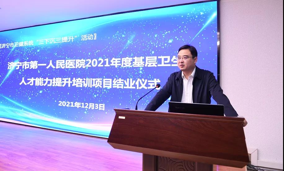 12月3日,2021年度卫生健康系统“三下沉三提升”基层卫生人才能力提升培训班结业仪式在济宁市第一人民医院举行。医院党委副书记、院长钟海涛,院党委委员、副院长肖要来,市卫生健康委医政医管科科长史斐斐出席会议,2021年度基层卫生人员培训学员参加会议。结业仪式由医院党委委员、副院长肖要来主持。