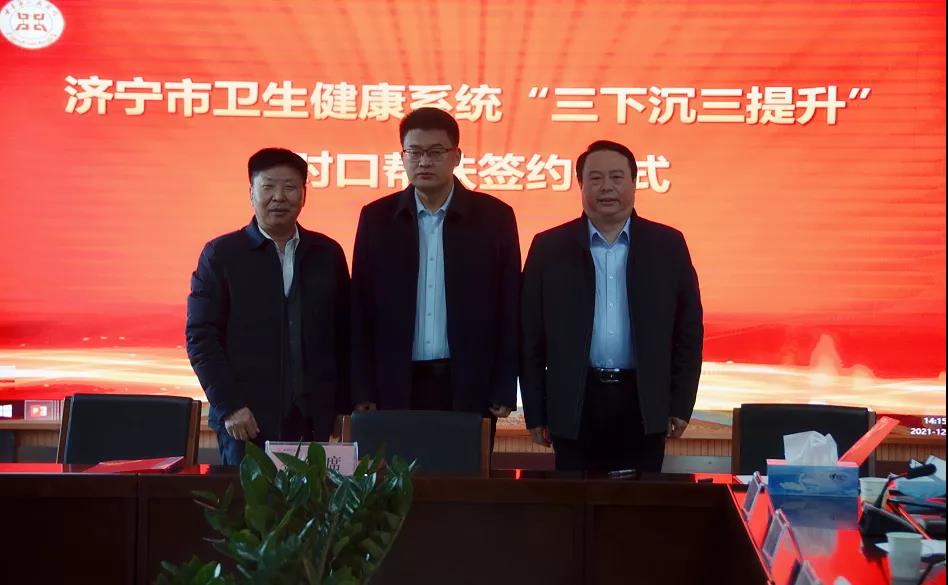 为进一步推动医疗卫生优质资源下沉,切实提升基层医疗服务能力,12月28日下午,济宁市第一人民医院与曲阜市人民医院签订“三下沉三提升”对口帮扶签约仪式。济宁市第一人民医院党委副书记、院长钟海涛,党委委员、副院长肖要来,曲阜市卫生健康局副局长兰玉杰,曲阜市人民医院党委书记王庆安,党委副书记、院长张建及班子成员,我院医联体办公室相关负责人参加了签约仪式。