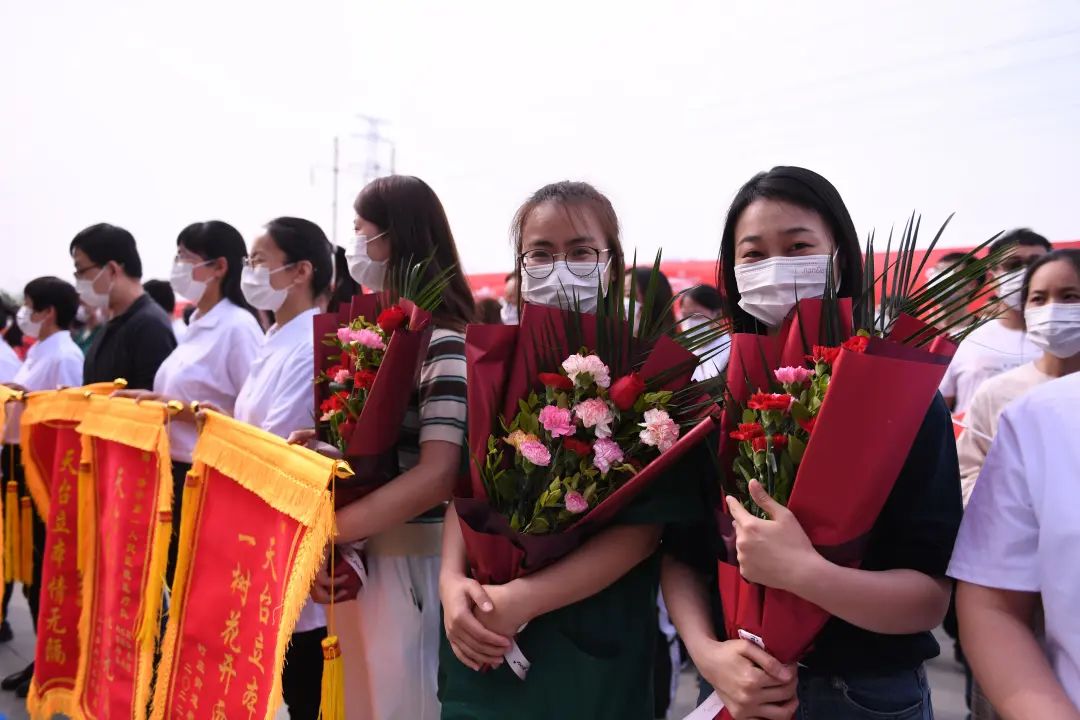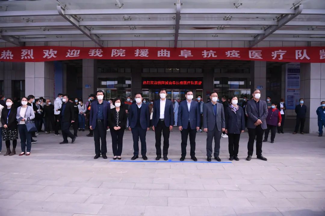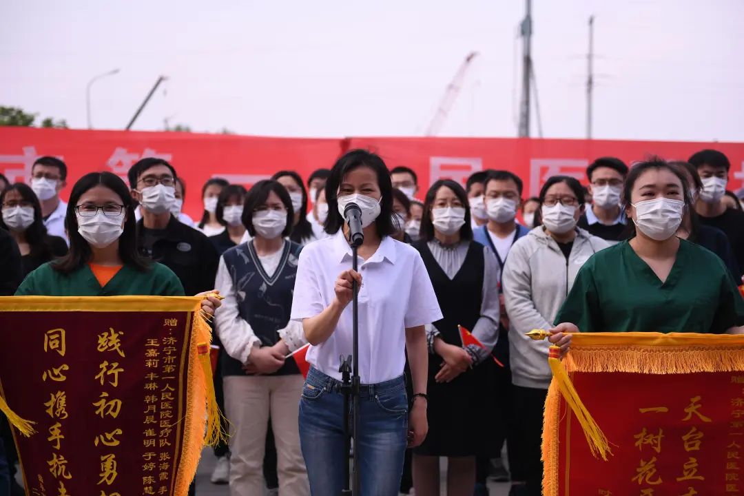 仪式上,支援曲阜抗疫队队长李伟主任在发言时激动地说,3月31日凌晨,医院接到济宁市疫情防控指挥部通知,迅速集结核酸采样医疗队共十批385人支援曲阜市抗疫核酸检测工作。其中核酸采样队349人,负责鲁城街道、时庄街道、陵城街道、尼山街道社区采集点72个,曲阜师范大学、济宁学院2所院校,每天釆集样本覆盖人群近12万。在连续奋战的16天时间里,我们全体队员团结一心,安全高效完成了采样任务。援曲医疗队共收到街道、社区等送来的锦旗23面,表扬信6封。在这里特别感谢全体队员的辛勤努力和顽强拼搏,也感谢院领导的关心和支持,因为有了坚强的后盾,我们才能在前方勇敢前行。