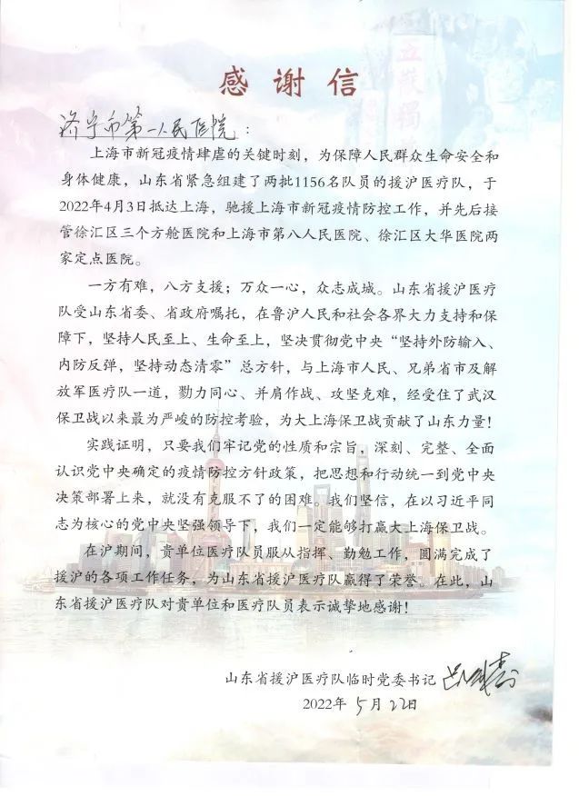 4月3日,10名援沪医疗队员逆行出征,临危不惧、冲锋在前,昼夜奋战、超负荷运转,先后参与龙耀路方舱医院、漕宝路方舱医院和上海八院、大华定点医院诊疗工作及徐汇区、闵行区社区居民核酸采样工作,历时50天,累计诊治新冠肺炎患者1625人,完成核酸采样1.6万余份。他们以精湛的医术、高尚的医德和稳扎稳打的战术,出色完成各项任务,实现了队员“零感染、零投诉”,患者“零死亡、零舆情”的骄人战绩,受到舱内患者和社区群众的一致好评,赢得了上海人民的高度赞誉。