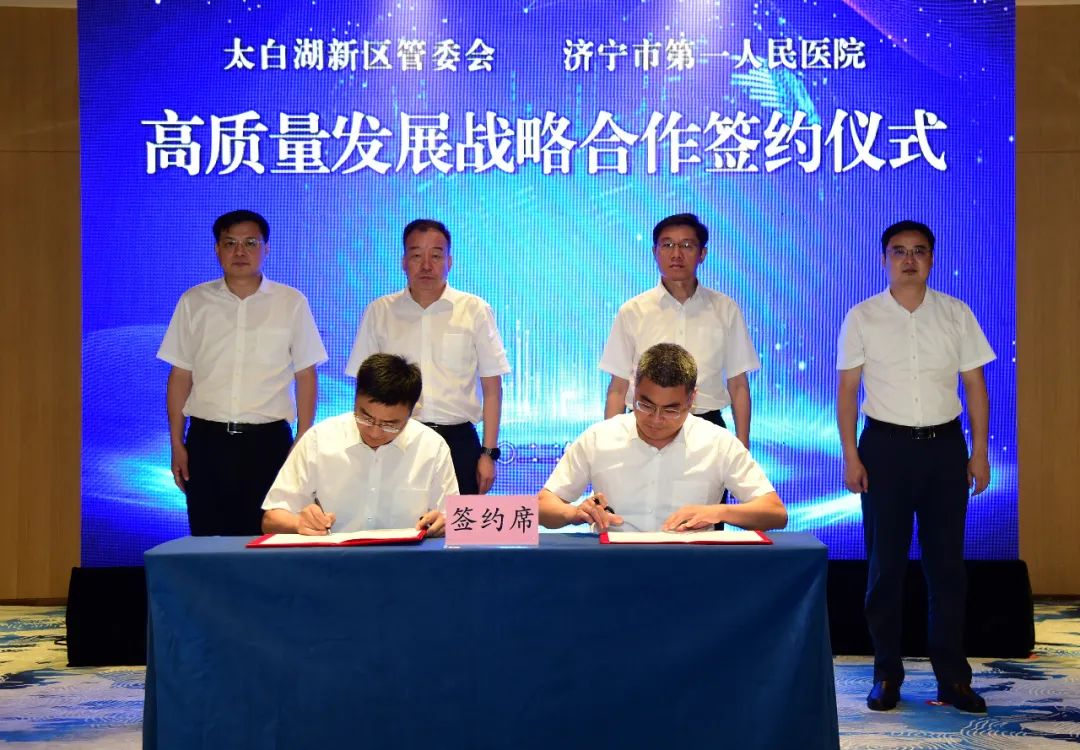 张德强、冯雷分别代表太白湖新区管委会、济宁市第一人民医院签署高质量发展战略合作协议。