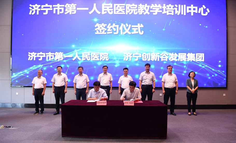 会上,医院副院长乔森与创新谷集团党委副书记、总经理郭电海进行“济宁市第一人民医院教学培训中心”项目签约。