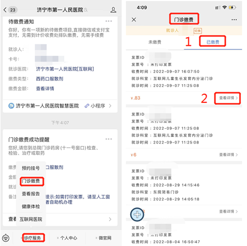 对于复诊患者,医生根据患者情况,通过线上门诊开具药品后,患者根据推送消息进入小程序,在线上诊疗缴费中缴费后,可到总院区门诊药房出示电子二维码线下取药。
