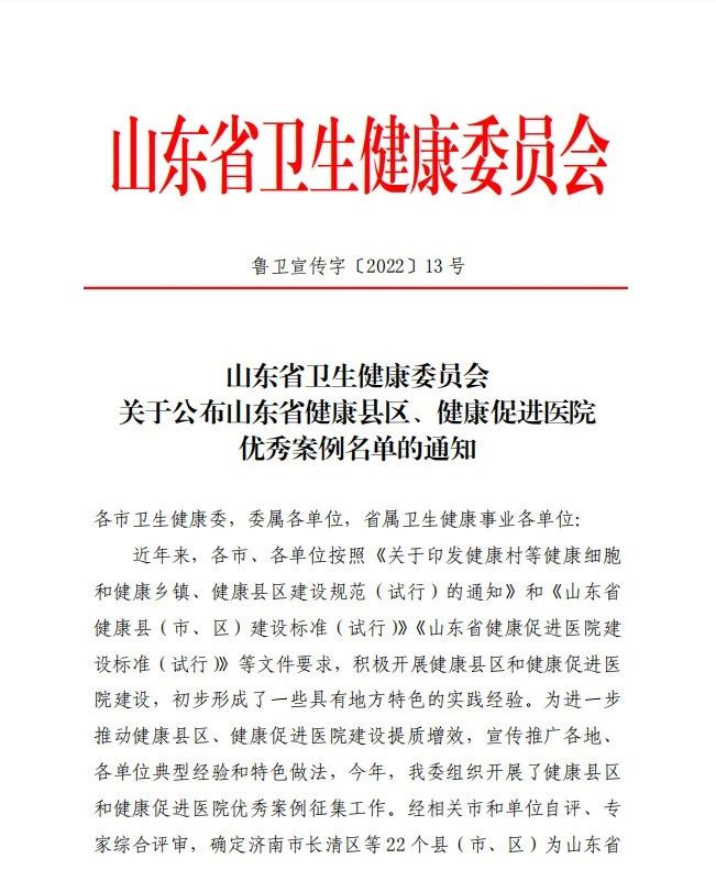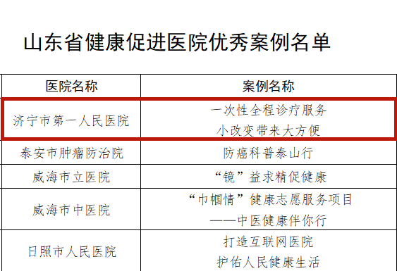 近日,山东省卫生健康委员会公布山东省健康县区、健康促进医院优秀案例名单,济宁市第一人民医院报送的《一次性全程诊疗服务 小改变带来大方便》,获评山东省健康促进医院优秀案例。