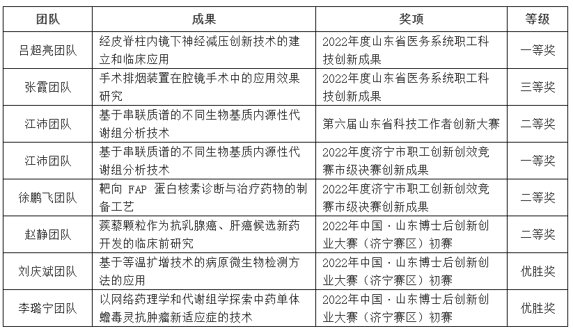 近年来,济宁市第一人民医院持续聚焦提升创新动能,把科技创新“关键变量”转化为医院高质量发展的“最大增量”。做强创新平台,聚集创新人才,促进科技成果转化,有效地改善了医院创新环境,激发了科技工作者的创新活力,创新成果初见成效,济宁市第一人民医院多个科研团队在省、市各级创新大赛中斩获佳绩,在科研成果应用领域崭露头角。
