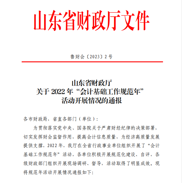 近日,山东省财政厅下发《关于2022年“会计基础工作规范年”活动开展情况的通报》,对于参与积极开展会计基础工作规范化建设,工作方法创新,取得优秀工作成果经验的单位给予通报表扬,济宁市第一人民医院获评“省级会计基础工作规范化单位”。