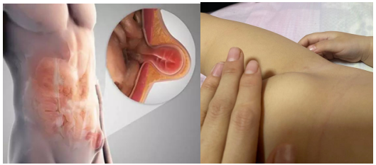 主要表现为腹部不定时出现肿块,站立时或腹压增加时肿块突出,早期通过平卧或用手按压后可消失或变小。