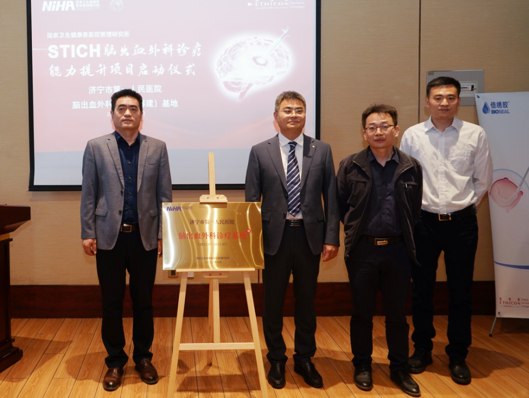 会上,医院副院长冯雷和神经外科主任王召平,共同为济宁市第一人民医院“脑出血外科诊疗基地”揭牌。冯雷院长指出,“脑出血外科诊疗基地”项目由国家卫生健康委医院管理研究所发起,旨在改善我国脑出血患者高发病率、高致残率和高死亡率的现状,进一步提升基层医院和医生脑出血诊疗能力,普及内镜微创先进理念,推进脑出血外科诊疗的规范化。