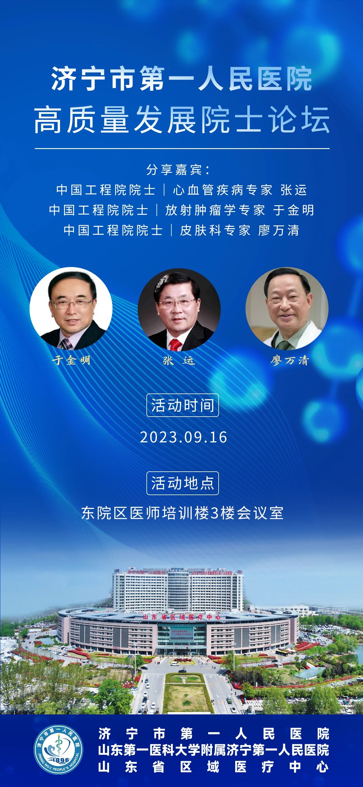 9月16日上午9点,济宁市第一人民医院将举办高质量发展院士论坛暨济宁市医学会医院管理分会学术交流会议。届时,将邀请中国工程院院士、心血管疾病专家张运,中国工程院院士、放射肿瘤学专家于金明,中国工程院院士、皮肤科专家廖万清授课,进行医院管理经验交流。期待和各位同道相聚在“孔孟之乡”—山东济宁,共享学术盛宴!