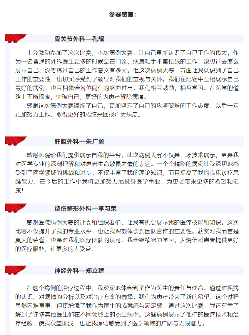 本次比赛共评选出一等奖1名,二等奖3名,三等奖6名。获得一等奖的为骨关节外科孔耀,获得二等奖的为肝胆外科朱广勇、烧伤外科、整形美容外科李习荣、神经外科郑立建,获得三等奖的为急诊监护室张远、重症医学科李君、神经外科卢文朋、呼吸与危重症医学科边翠霞、儿童康复科盛志强、重症医学科周素梅。