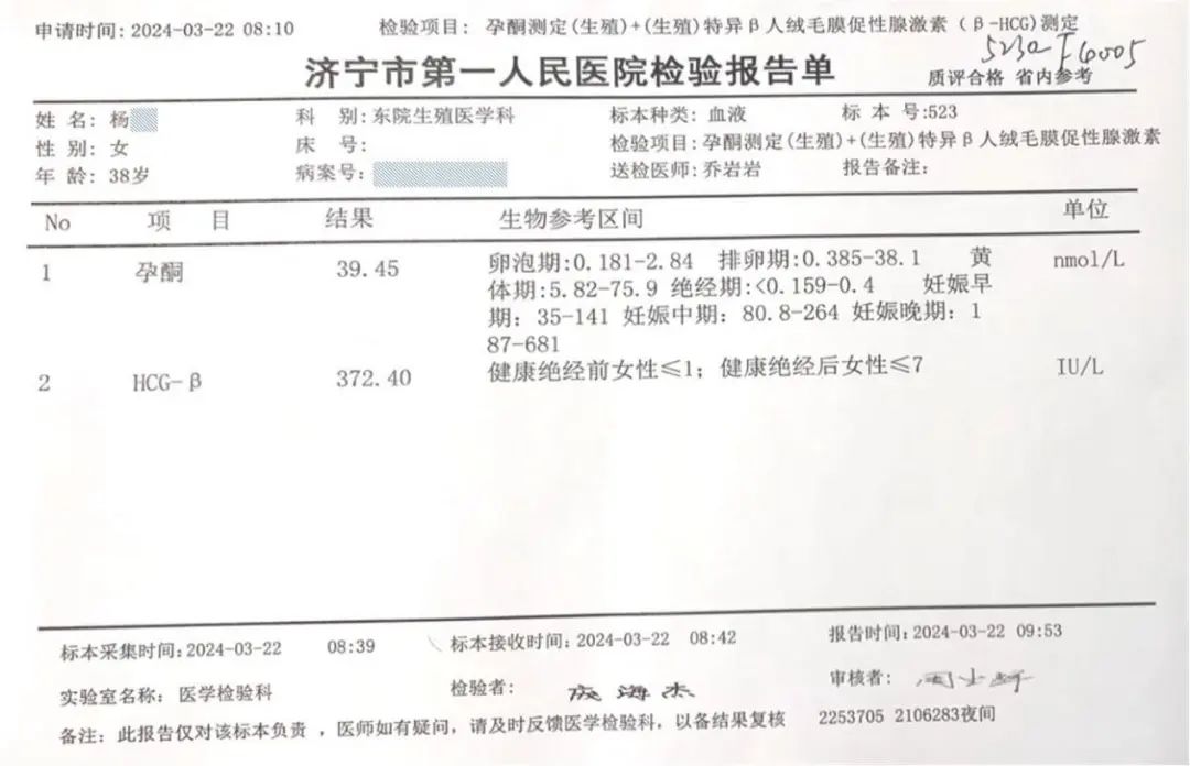 乔岩岩接诊后为杨女士做了详细检查与全面评估,仔细研究了杨女士既往外院助孕的用药方案和诊疗经过,为其制定了适合她的个体化促排卵方案及胚胎移植方案,并反复斟酌观察考量杨女士助孕过程中每次的用药反应及检查结果,不放过每一个可能会影响其助孕结局的一个个小细节,为其精细化用药调整。2023年12月9日,杨女士顺利完成了取卵,全胚冷冻。2024年1月12日进行了冻胚移植,移植后给予黄体支持,遗憾的是,这一次并没有迎来好消息。杨女士再次鼓起勇气,2024年3月10日进行了第2次冻胚移植,移植后的每一天杨女士都无比焦虑、紧张不安,向其北京单位请假多天留在老家,多次返回科室就诊,乔岩岩主任针对其身体及心理不适,为其调整用药并给予心理安慰,移植后第9天查血HCG:91.84IU/L,3天后复查血HCG理想翻倍。