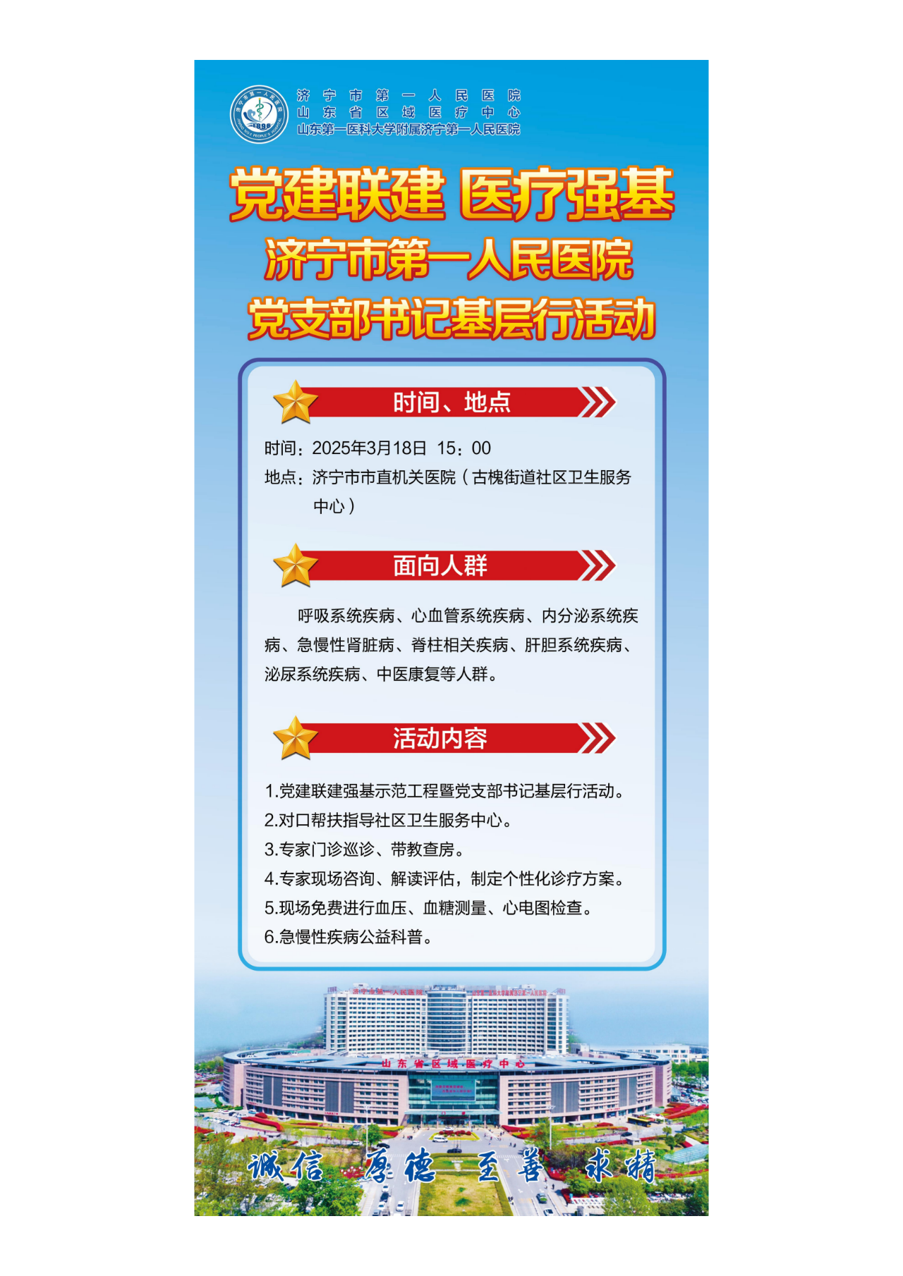 为落实新时代党的建设总要求,响应国家、省、市医疗卫生强基工程号召,推动党建联建工作走深走实。济宁市第一人民医院党委组织全院各级党组织,每月18日开展“支部书记基层行”活动,通过与村(社区)、企事业单位、行政机关等基层党组织深度融合联建,充分发挥医院省级区域医疗中心资源优势和联建党组织政策、服务、群众等方面的资源优势,持续改善患者就医体验,全面推动三甲优质医疗资源纵向流动和均衡共享。按照“一支部一特色,一支部一品牌”的思路,医院分期对“支部书记基层行”活动进行宣传报道,培育特色鲜明、内涵丰富的党建品牌,不断提升医院品牌影响力,助力医院全面高质量发展。