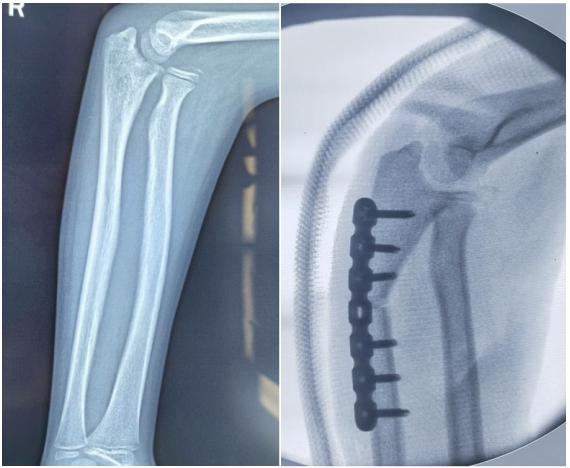 手术当日,由小儿外科科主任庄博主刀,苏涛、孔令启医师协助,在麻醉科与手术室团队的密切配合下有序开展。凭借丰富经验与精湛技术,依次完成尺骨截骨矫形钢板固定、桡骨头复位及环状韧带修复。整个过程操作精细,术后影像学检查显示桡骨头复位稳定,患儿生命体征平稳。