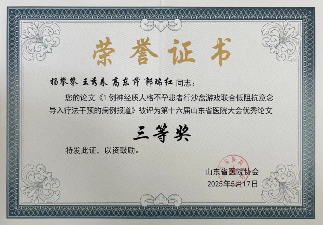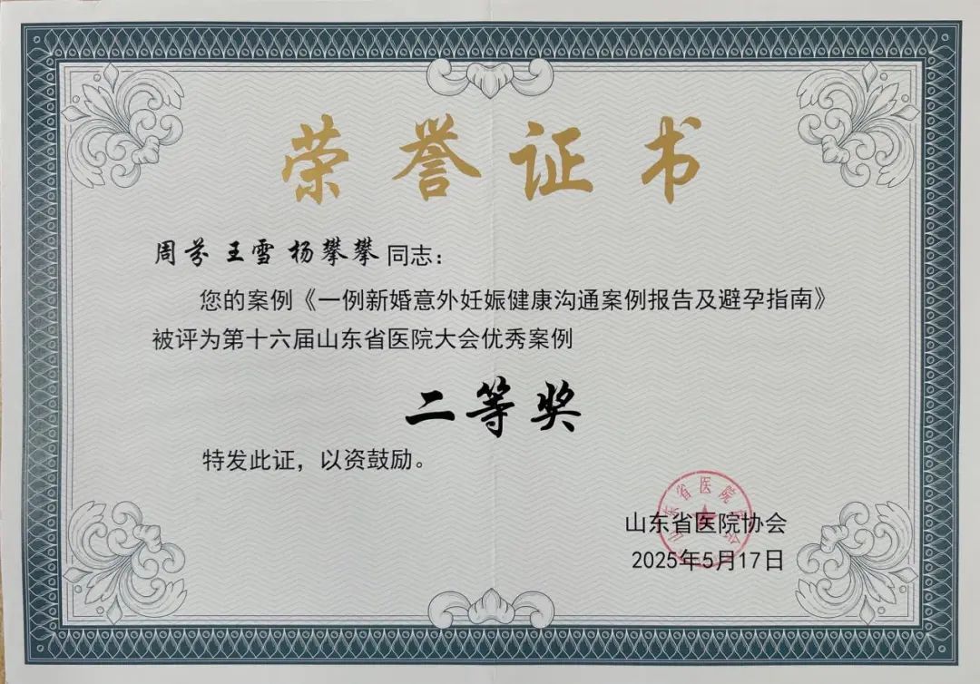 在第十六届山东省医院大会中,生殖医学科护理团队周芬、王雪、杨攀攀提交的《一例新婚意外妊娠健康沟通案例报告及避孕指南》荣获案例二等奖,凸显临床沟通与健康管理实践创新能力;杨攀攀提交的《1例神经质人格不孕患者行沙盘游戏联合低阻抗意念导入疗法干预的病例报道》斩获优秀论文三等奖,展现心理干预与个性化护理探索成果。