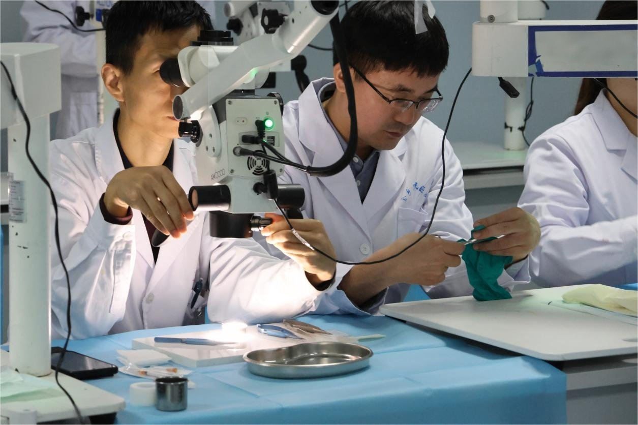 本次培训课程设计紧扣临床需求。手外科足踝外科主任曾文超详细讲解了显微外科发展历程、显微镜调节技巧、持针进针角度与间距、八点式血管吻合技术及血栓预防措施。随后,神经外科范高阳补充讲解显微血管吻合基础知识,并同步示范操作要点。手外科足踝外科王福宁、口腔颌面外科李新磊分别针对手套缝合打结、血管裸化与端端定点缝合开展教学,学员依次在硅胶血管、胎盘血管上完成基础实操,指导老师实时点评纠错。
