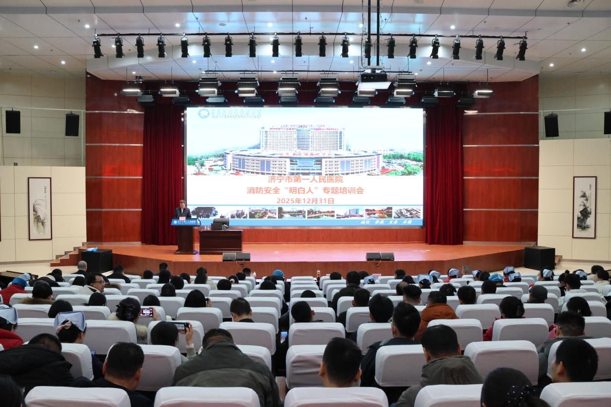 2025年12月31日,济宁市第一人民医院举办“消防安全明白人”专题培训。济宁市第一人民医院党委委员、副院长韩捷,济宁市高新区消防救援大队教导员(高级工程师)赵福军出席,医院临床、护理、医技、行管后勤以及三方公司“消防安全明白人”共300余人参加培训。专题培训由医院保卫部主任胡龙江主持。