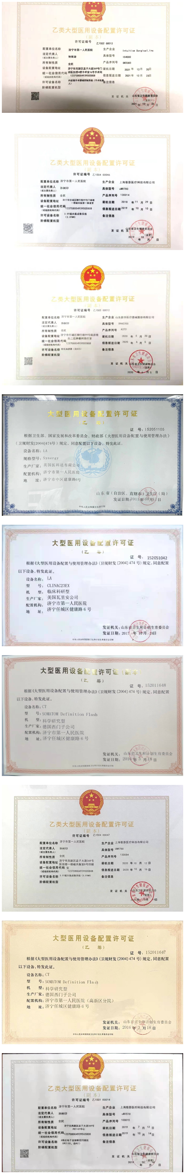 目前医院共有20台乙类大型医用设备:8台磁共振(MR)、7台CT、3台直线加速器(LA)、1台PET/CT、1台内窥镜手术器械控制系统(手术机器人),均有乙类大型医用设备配置许可证。