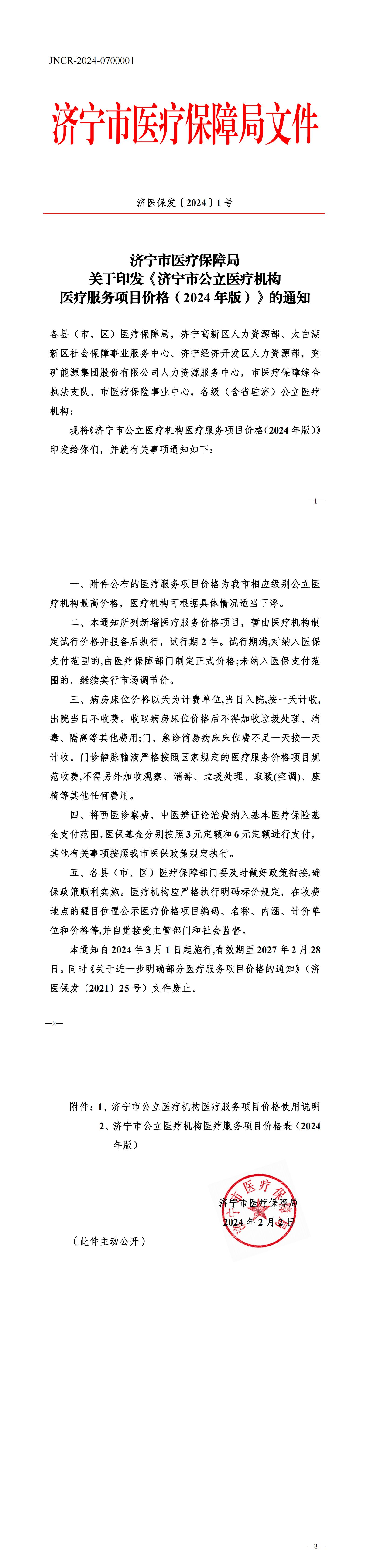 济医保发〔2024〕1号——关于印发《济宁市公立医疗机构医疗服务项目价格(2024年版)》的通知(1)