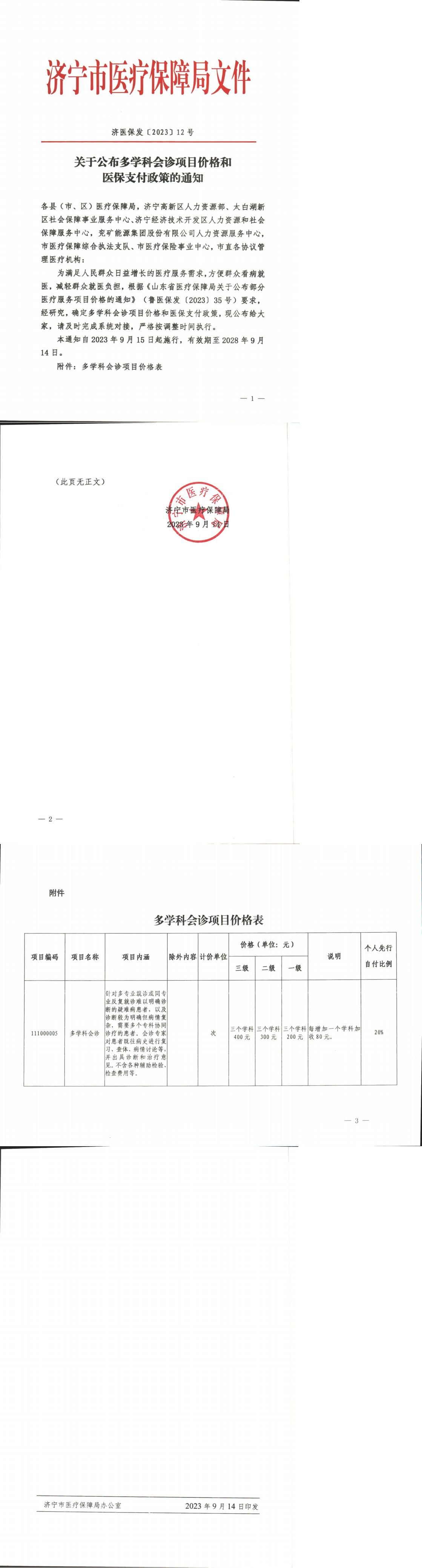 济医保发〔2023〕12号—《关于公布多学科会诊项目价格的通知》收费文件