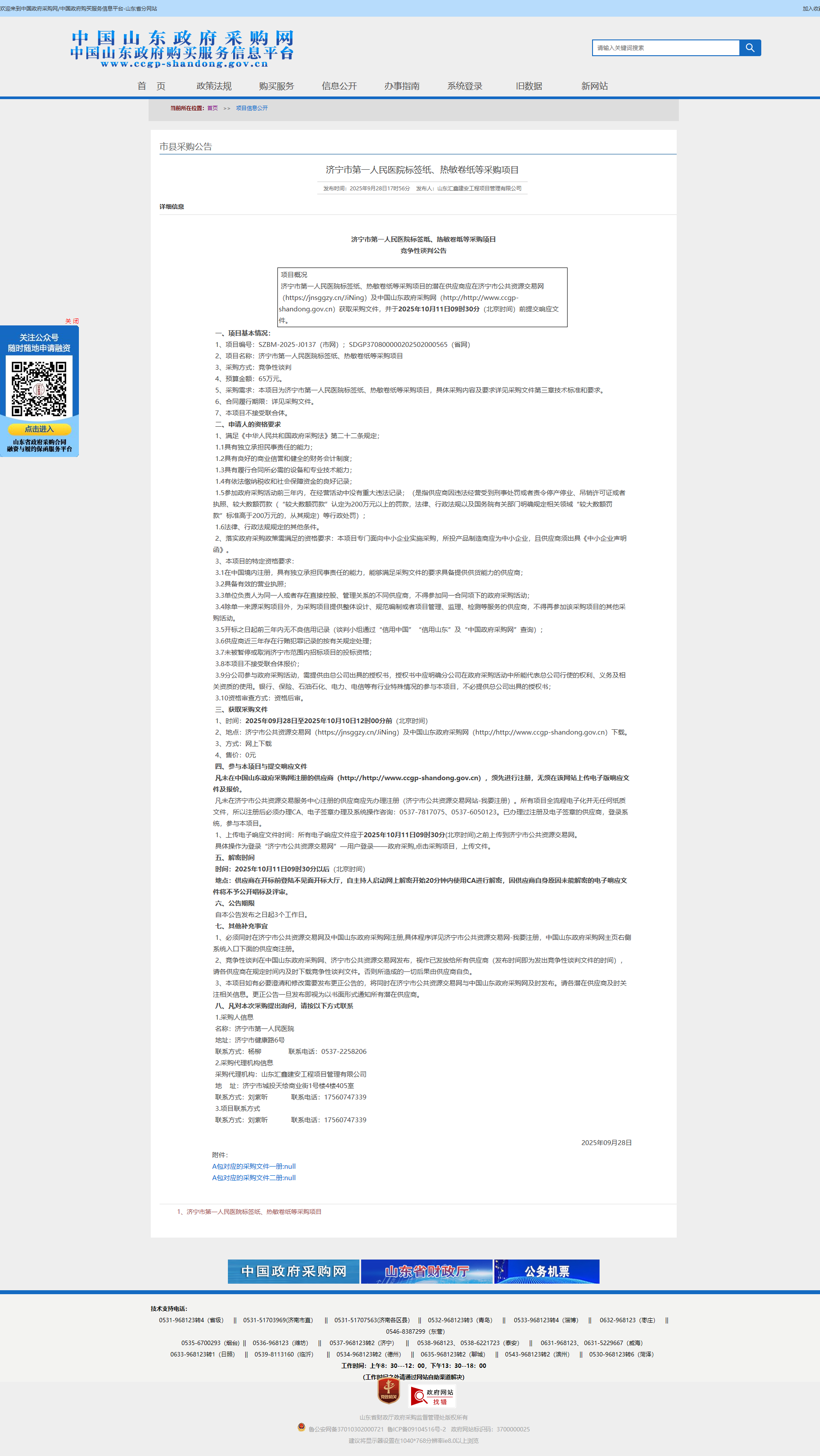 济宁市第一人民医院标签纸、热敏卷纸等采购项目竞争性谈判公告