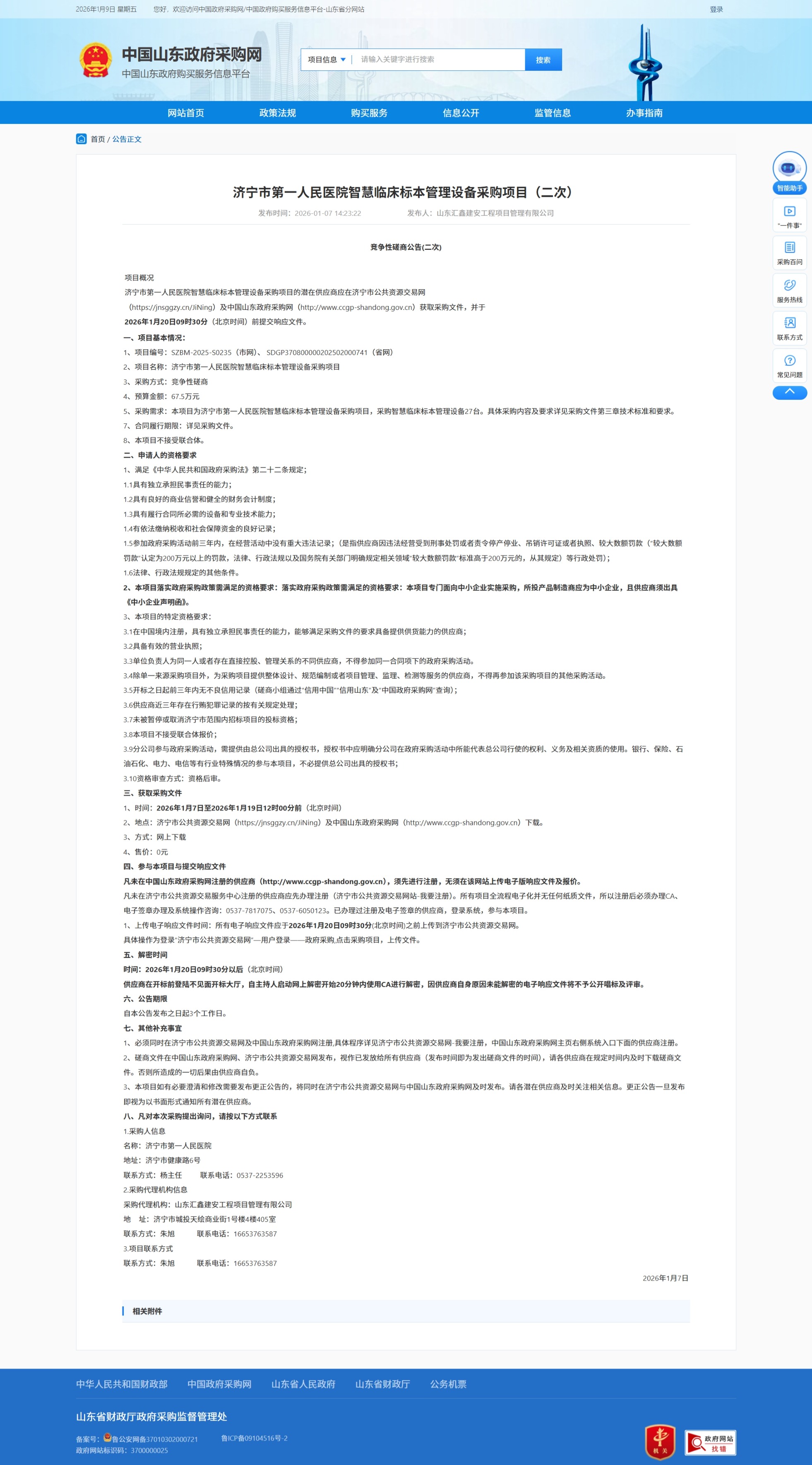 济宁市第一人民医院智慧临床标本管理设备采购项目竞争性磋商公告(二次)