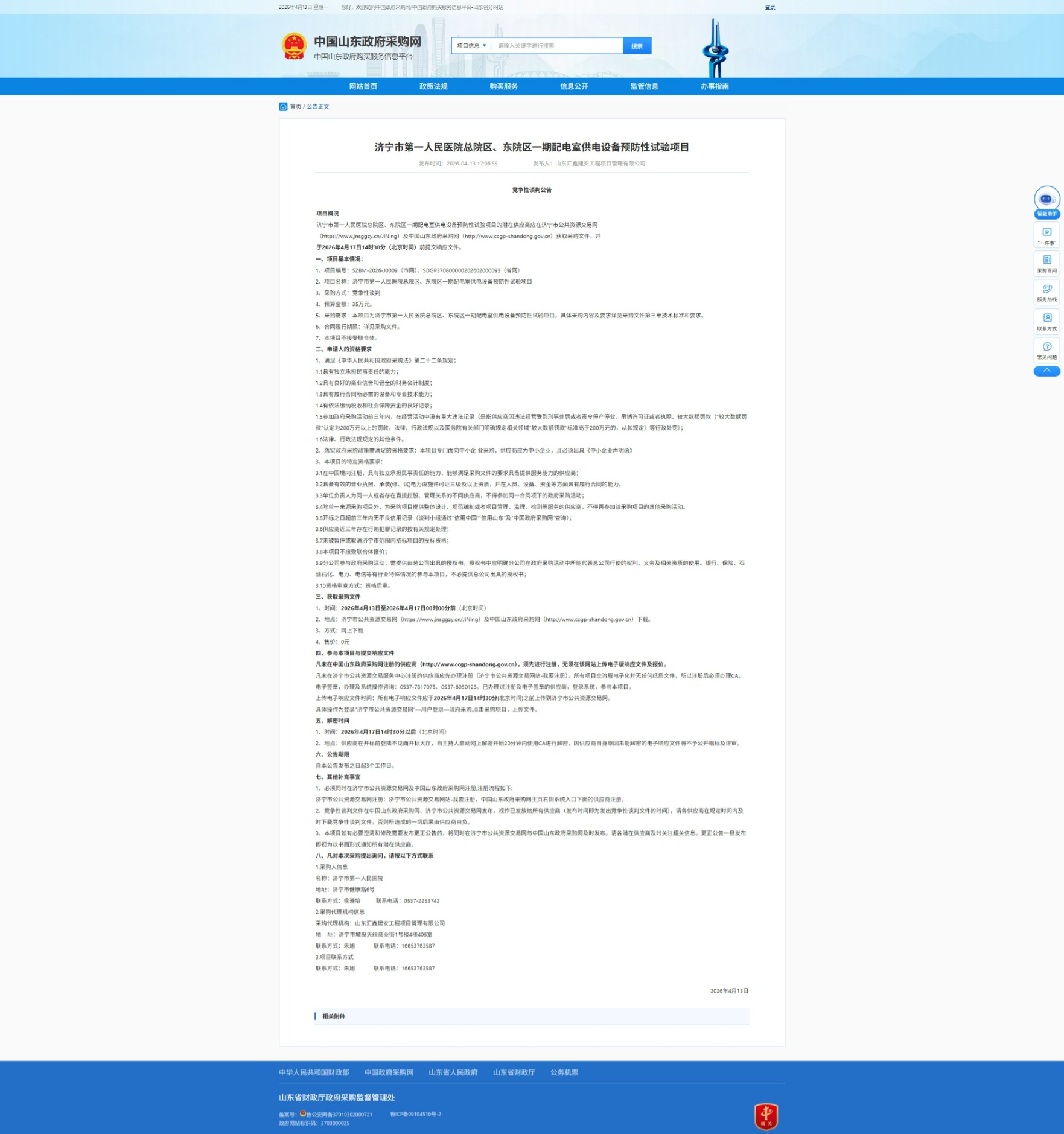 济宁市第一人民医院总院区、东院区一期配电室供电设备预防性试验项目竞争性谈判公告