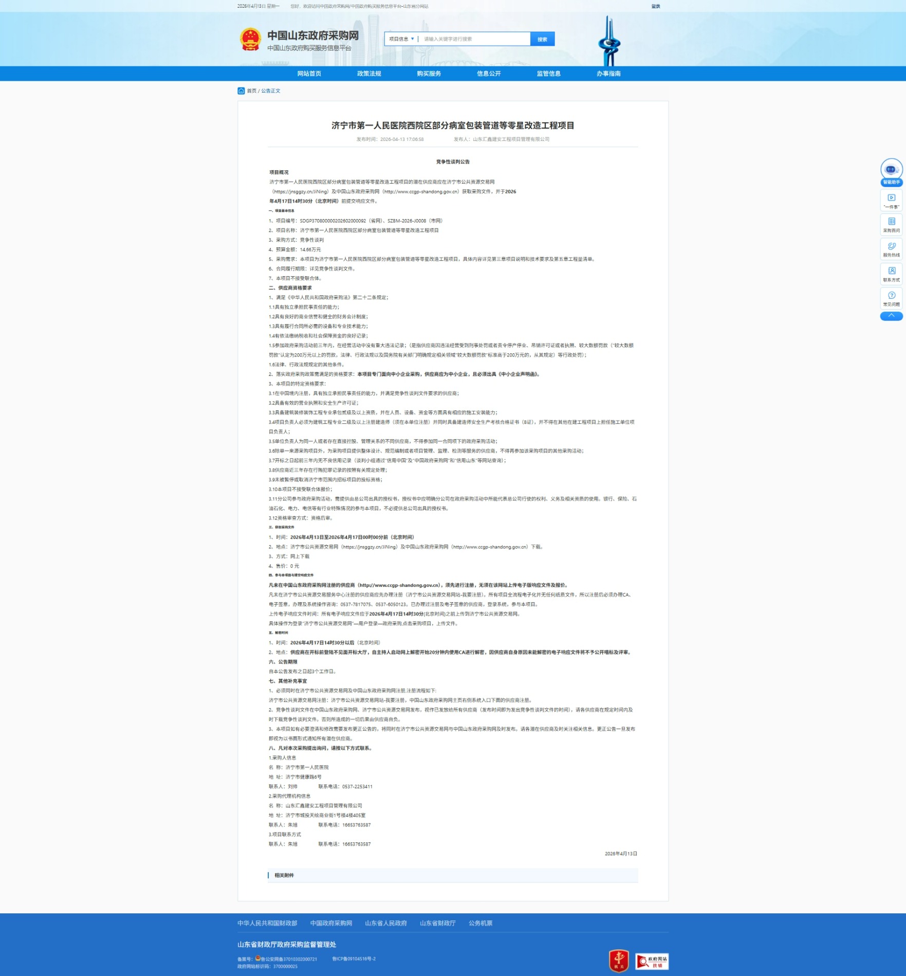 济宁市第一人民医院西院区部分病室包装管道等零星改造工程项目竞争性谈判公告