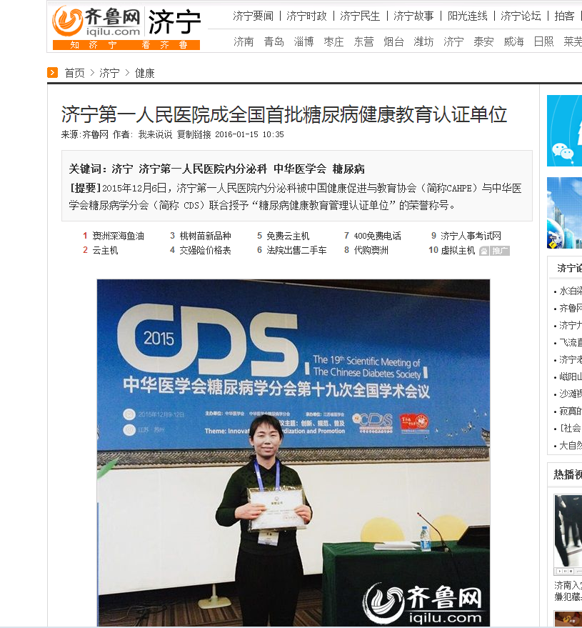 齐鲁网--济宁第一人民医院成全国首批糖尿病健康教育认证单位
