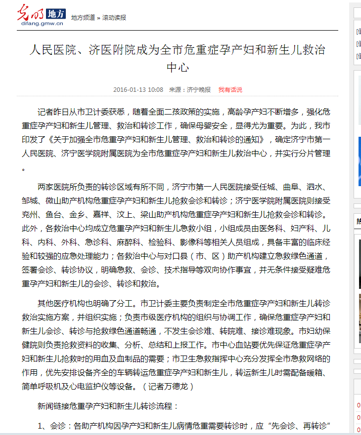 光明网--人民医院、济医附院成为全市危重症孕产妇和新生儿救治中心