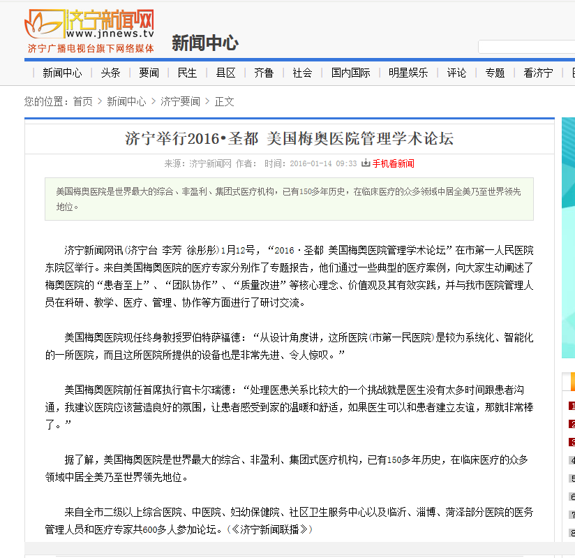 济宁新闻网--济宁举行2016•圣都 美国梅奥医院管理学术论坛