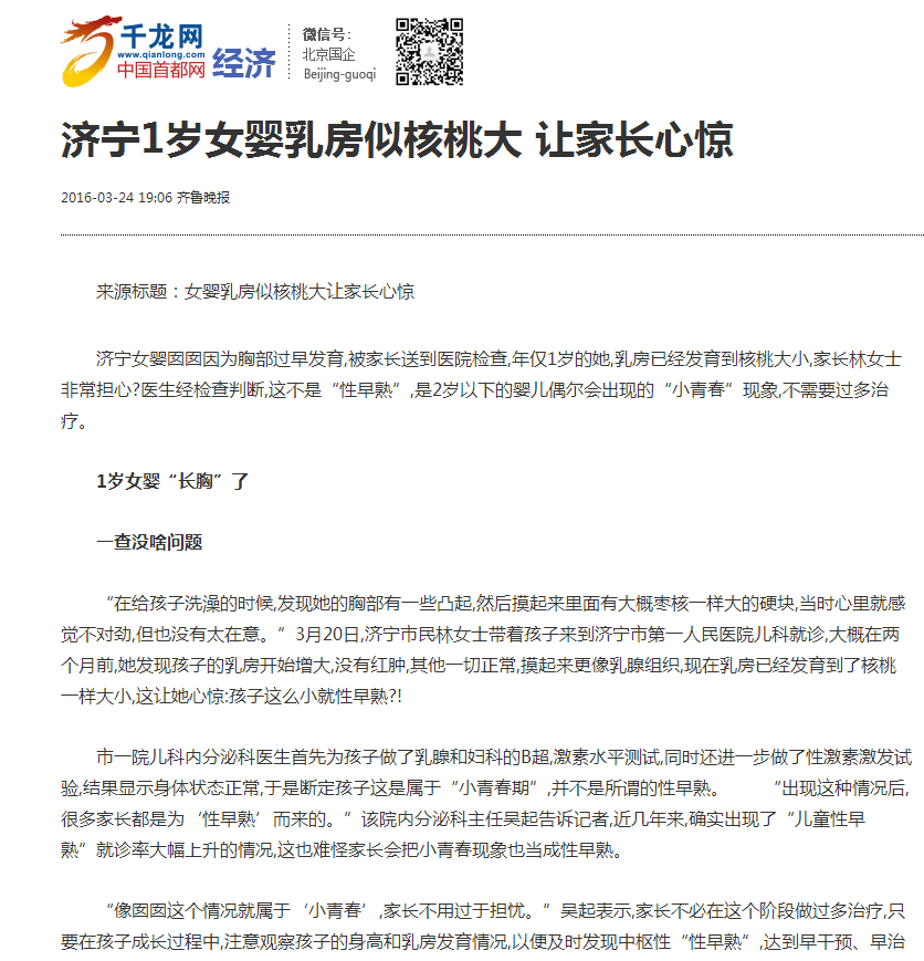 千龙网--济宁1岁女婴乳房似核桃大 让家长心惊