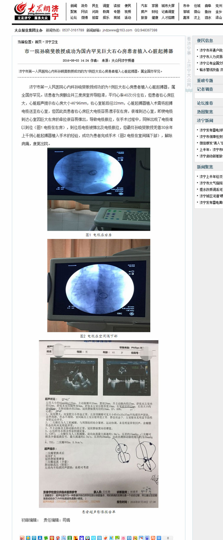 大众网-市一院孙晓斐教授成功为国内罕见巨大右心房患者植入心脏起搏器