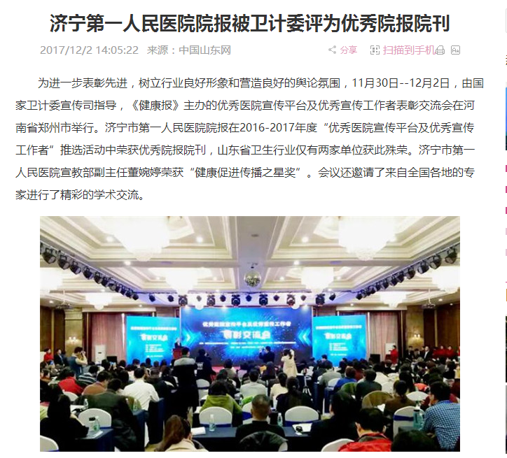 中国山东网--济宁第一人民医院院报被卫计委评为优秀院报院刊