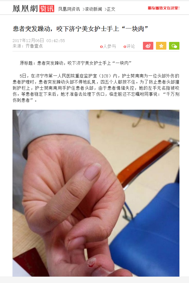 凤凰网--患者突发躁动,咬下济宁美女护士手上“一块肉”
