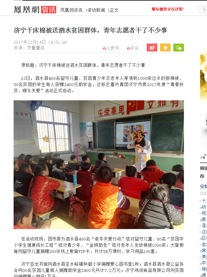 凤凰网--济宁千床棉被送泗水贫困群体,青年志愿者干了不少事