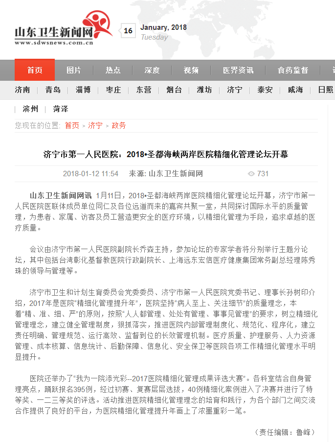 山东卫生新闻网--济宁市第一人民医院:2018•圣都海峡两岸医院精细化管理论坛开幕